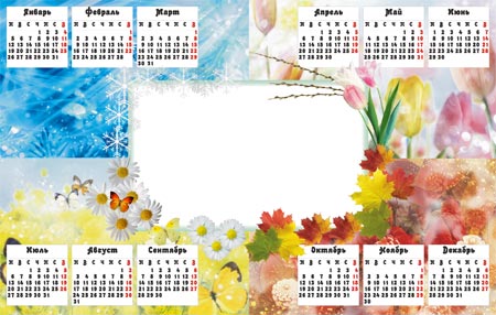 В оформлении этого календаря используются все времена года, в центре есть место для вашей фотографии.