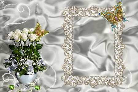 Красивая рамка с букетом цветов и драгоценными бабочками.