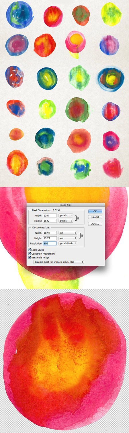 Набор акварельных текстур круглой формы на прозрачном фоне.