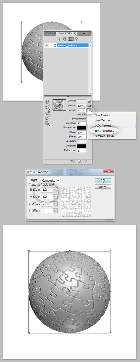 Кусочки пазла слишком большие, мы немного маштабируем текстуру. Снова кликните на маленький значок папки Bump (Рельеф) текстуры, выберите Edit Properties (Изменить свойства). В открывшемся диалоговом окне установите следующие параметры: шкала значений U и V - 1,2. Это позволит немного уменьшить размер кусочков. Давайте добавим больше деталей к нашей сфере.