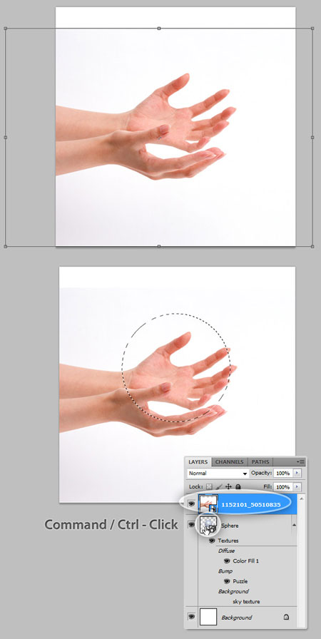 Откройте картинку с руками (можете найти сами на бесплатных сайтах с фото), скопируйте и вставьте на слой выше 3D сферы (Совет: можете перетащить изображение на документ и оно вставится как смарт-объект автоматически). Измените размер (Ctrl + T), чтобы сопоставить вогнутость рук с радиусом сферы.
