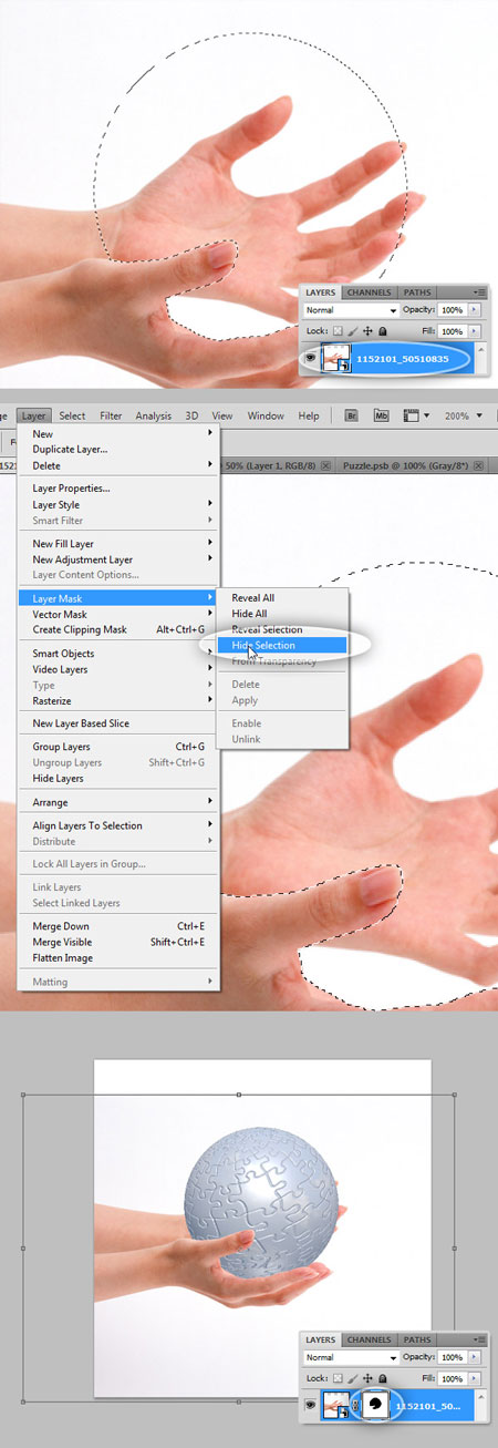 Не снимая выделения, перейдите на Layer> Layer Mask> Hide Selection (Слои - Слой-маска - Спрятать выделенную область). Если вы сделаете это правильно, сфера будет находиться в руках. Затем нажмите Ctrl + D чтобы снять выделение.