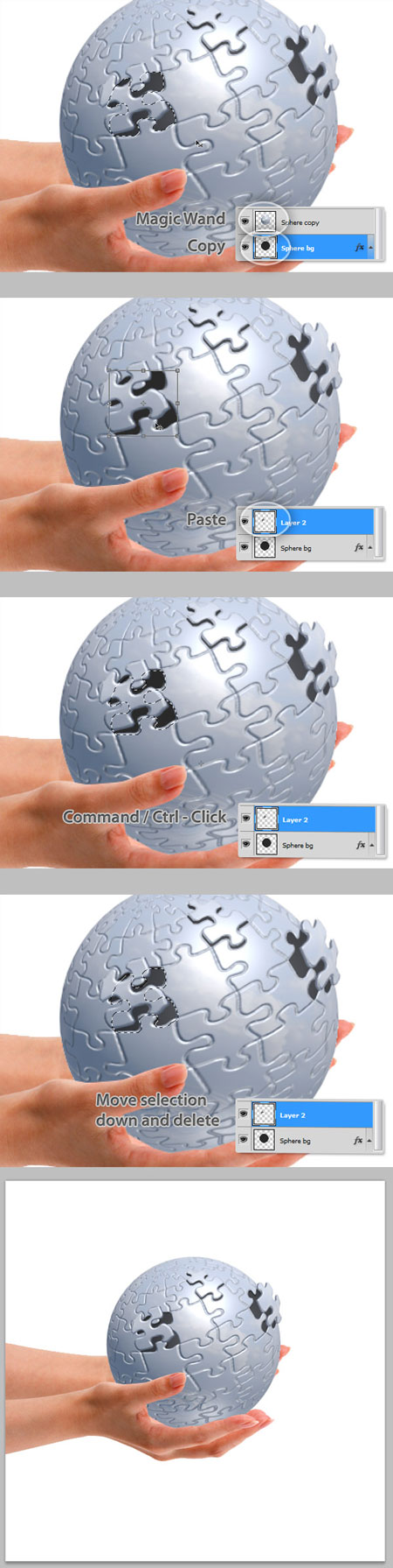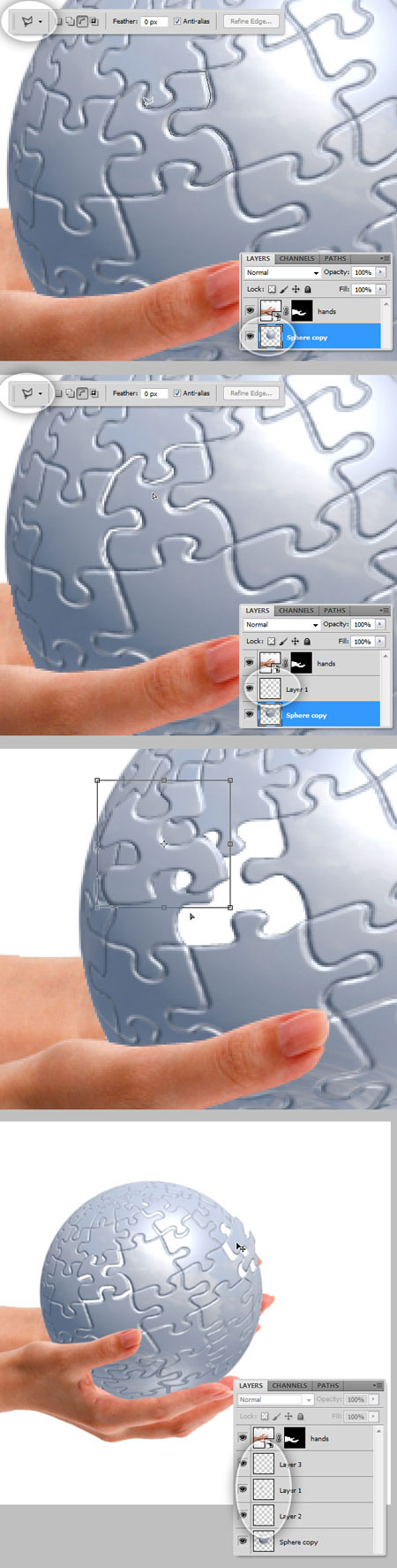 Теперь будем работать с растрированой копией 3D сферы. Выберите Lasso Tool (Лассо) на панели инструментов и сделать выделение вокруг одной части пазла (это может быть любая часть). Затем вырежете (Ctrl + X) и вставьте (Ctrl + V) кусок на новый слой, повторите этот шаг столько раз, сколько вам нужно.