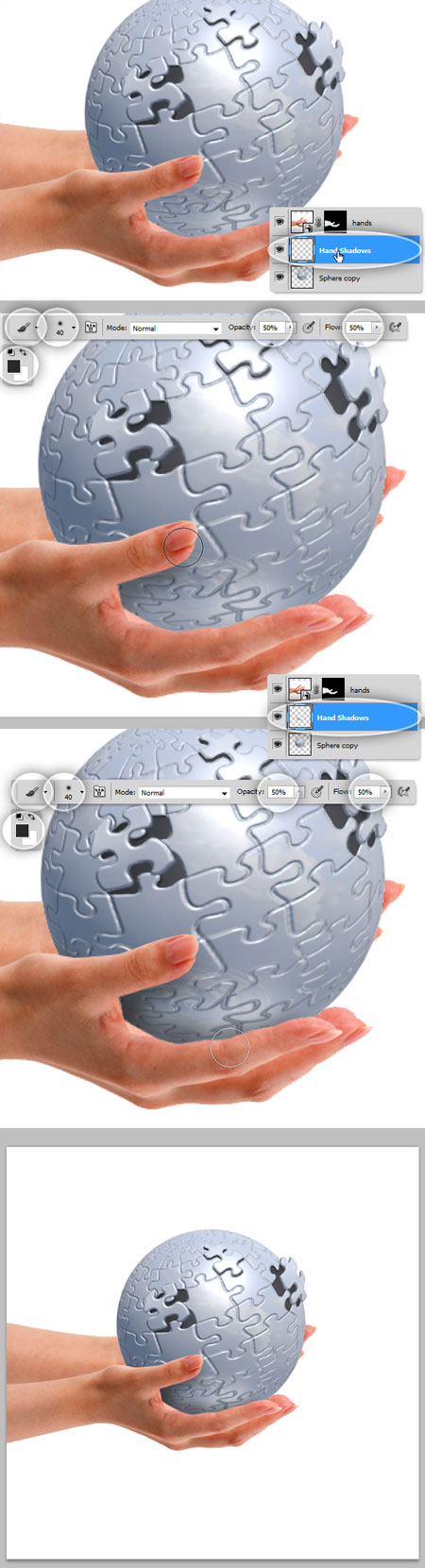Давайте добавим тень от рук. Создайте новый слой и назовите "Тень от рук" выше слоя «Сфера копия". Используя Brush Tool