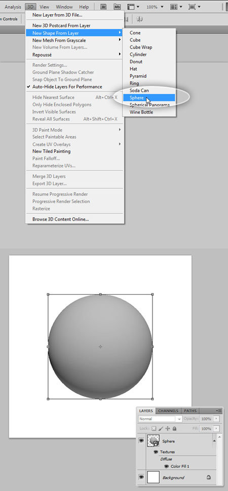 Теперь давайте начнем с главного элемента этого урока - сферы. Выберите верхний слой и нажмите 3D > New Shape From Layer > Sphere (3D – Новая фигура из слоя – Сфера). В результате мы получим отличную серую сферу. Вы можете редактировать этот 3D-объект, поворачивать его, масштабировать, и прочее. Измените название слоя на "Сфера" в панели Слои.