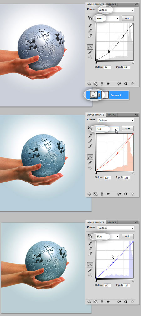 Добавьте новый корректирующий слой Curves (Кривые). Поместите выше всех слоев. Установите значения, как на рисунке ниже. Уделите внимание общим цветам RGB и красному и синему каналам.