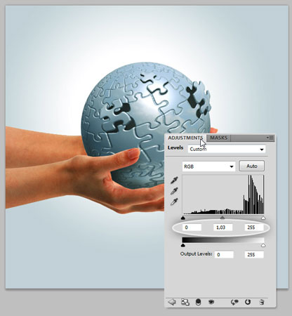 Убедитесь, что слой с руками выше слоя со сферой, установите значение непрозрачности слоя до 50%, таким образом, лучше видна позиция рук.