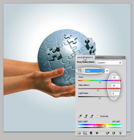 Затем добавьте корректирующий слой Hue / Saturation (Оттенок/Насыщенность), выберите красный цвет и установите значения, как показано на рисунке ниже.