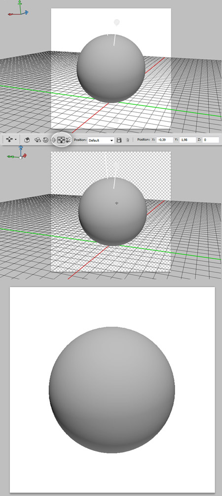 Теперь мы немного передвинем сферу, чтобы она выглядела ближе к нам, используя инструмент Slide Tool (Скольжение) из панели 3D-инструментов. Обратите внимание на панель 3D-инструментов слева. По умолчанию активен инструмент Rotate Tool (Вращение). Кликните правой кнопкой мыши, чтобы увидеть другие инструменты. Так же вы можете их видеть на верхней панели. Выберите инструмент Slide Tool (Скольжение), щелкните и приблизьте сферу за верхнюю часть, двигая спереди и сзади, попытайтесь получить результат, как на последнем рисунке.