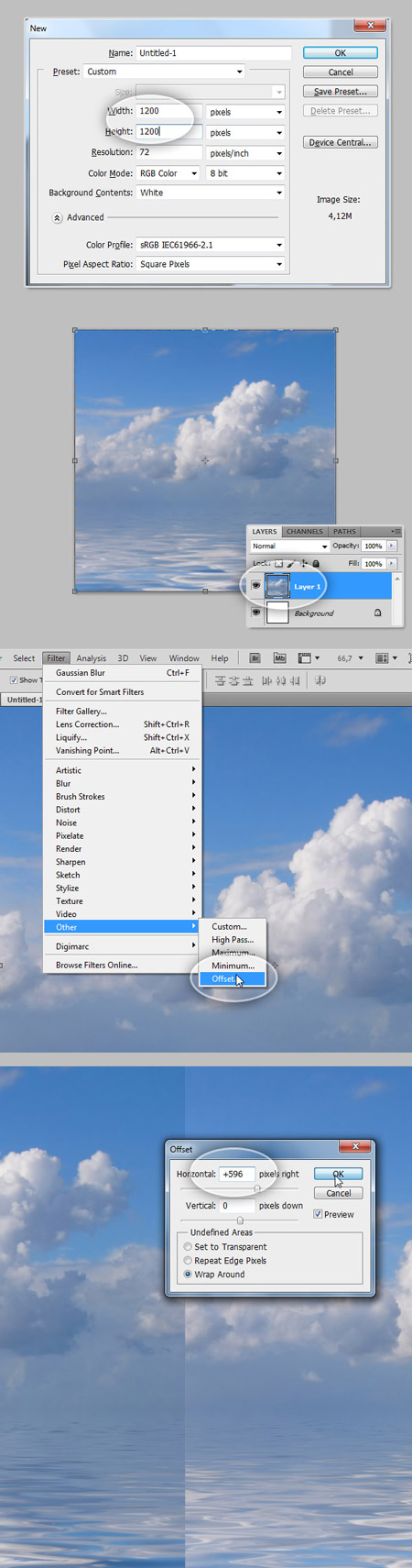 Затем перейдите на Filter> Other> Offset (Фильтр – Другие – Сдвиг), в диалоговом окне установите значение Horizontal value (Минимальное горизонтальное значение) около 500 - 600. У вас должно получиться примерно, как на рисунке ниже.