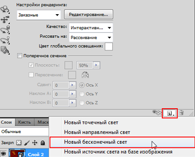 Шаг 9. Теперь нужно добавить немного освещения. Для этого вернитесь в палитру 3D. Внизу палитры кликните на иконке «Создать новый источник света» и выберите пункт «Новый бесконечный свет». Его настройки оставьте по умолчанию.