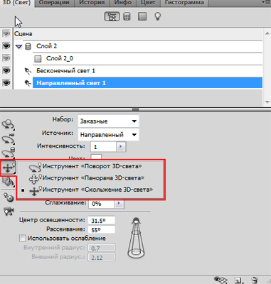 Еще раз кликните на иконке «Создать новый источник света», и создайте «Новый направленный свет». Теперь нам понадобятся инструменты управления источником света.