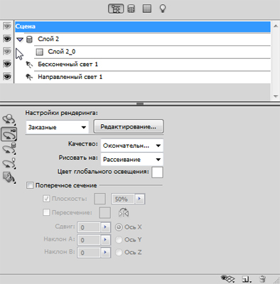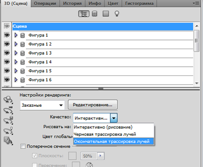Шаг 17. После того как сделали тень, осталось только провести трассировку 3D фигуры. В 3D палитре активируйте Сцену и переключите качество на: Окончательная трассировка лучей.
