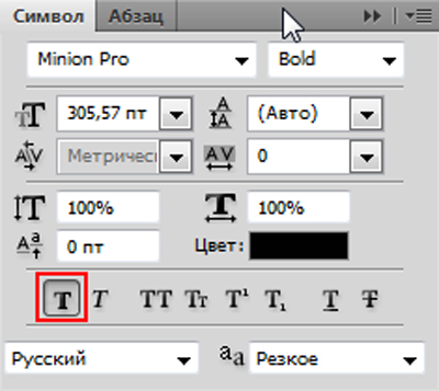 , Размер примерно 300пт (размер текста всегда можно изменить свободным трансформированием). Цвет не имеет значения, на 3D объекте мы сможем изменить его в любой момент. Откройте Окно-Символ, и включите псевдополужирный текст.