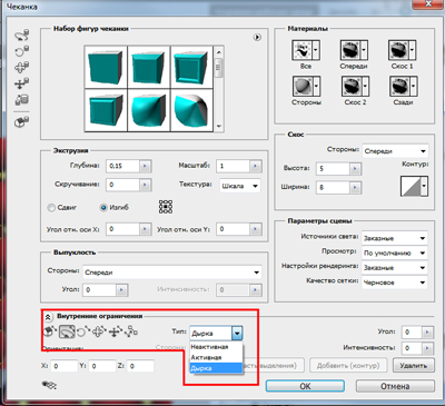 Активируйте любой из инструментов Внутреннего ограничения, кликните на первой букве, в которой нужно восстановить отверстие (у меня это цифра 8), и переключите Тип на: Дырка (см. скриншот). Повторите это со всеми буквами, в которых нужно сделать дырку.