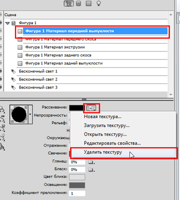Шаг 13. Перейдите в палитру 3D, активируйте любой материал фигуры, кликните на значке редактирования текстуры рассеивания и удалите текстуру