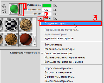 Для того что бы, не изменять вручную все 5 материалов, нужно определить свой материал из того что вы сделали. Для этого кликните на значке выбора материала (1) , затем на значке параметров материалов (2), и выберите команду: Создать материал,. В отрывшемся окне присвойте ему какое-нибудь имя. Ваш материал добавится в конце набора.