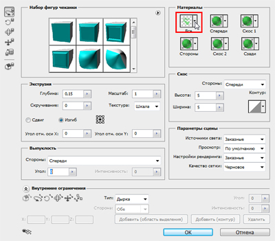 Шаг 12. Растрируйте и объедините слой фигуру и текстовый слой. Для этого в палитре слоев выделите эти 2 слоя, и нажмите сочетание Ctrl + E, или клик ПКМ на слое с фигурой и дайте команду- Объединить слои. Загрузите выделение этого слоя: Ctrl + Клик по иконке слоя. Перейдите в меню 3D и дайте команду Чеканка-Текущее выделение. В открывшемся окне введите такие настройки Экструзия: Глубина 0,15 Масштаб 1 Скос: Высота 5 Ширина 5.