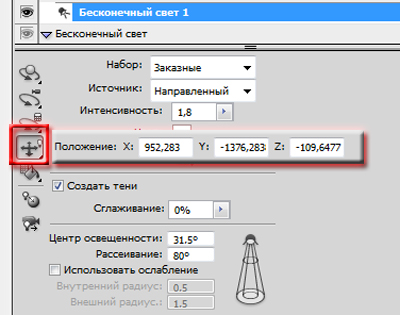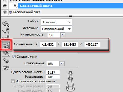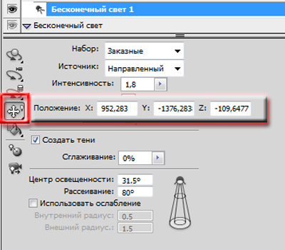 Теперь нужно настроить этот источник света. Измените его Интенсивность на 1,5-2 Центр освещенности:31,5 Рассеивание 80 Далее нам понадобятся инструменты управления светом. Вы можете попробовать сами, переключаясь между ними настроить свет, так как вам нравится. Я же покажу вам скриншоты настроек своих инструментов.