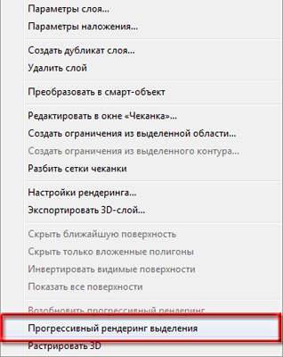 Кликните мышкой в любом месте, что бы остановить рендеринг. Затем загрузите выделение слоя Ctrl + Клик по иконке слоя. Клик ПКМ на слое в палитре слоев, и дайте команду: Прогрессивный рендеринг выделения. Теперь подождите, пока закончится обработка.