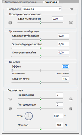 Теперь можно применить фильтр Коррекция дисторсии. Настройки могут отличаться в зависимости от изображения, у меня это такие: Вкладка Заказная, Виньетка Эффект -100 (ползунок до конца влево).