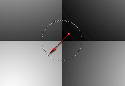Снова возьмите инструмент градиент, не изменяя настройки которые остались после Шаг2, зажмите Shift (чтобы градиент шел точно под 450) и протяните его внутри полученного выделения от точки немного выше и правее центра выделения, до края. Следите, что бы он прошёл точно через центр выделения (смотрите скриншот).