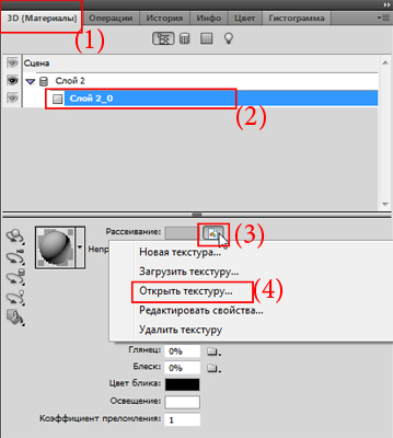 Шаг 4. Откройте палитру 3D (1), активируйте сетку Слой 2_0 (2) Кликните на значке текстуры рассеивания(3) и дайте команду Открыть текстуру(4)