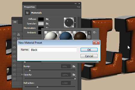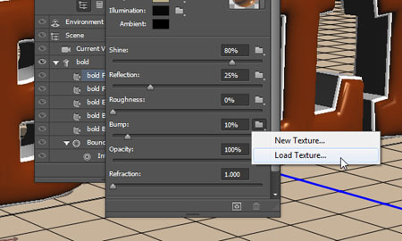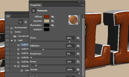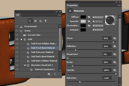 Выделите в 3D панели Материал передней выпуклости (Front Inflation Material). Затем в панели свойства измените для Рассеивания (Diffuse) цвет на #792500, Цвет блика (Specular) на # bbb08c, Свечение (Illumination) на #080808 и Освещение (Ambient) на #000000. Кроме того, измените Блеск (Shine) до 80% для создания небольшого блика и измените значение Отражения (Reflection) до 25% для создания отражения поверхности.