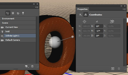 Кликните на иконку Координаты (Coordinates) в верхней части панели свойств. Теперь измените значения вращения, как показано ниже: (X = 10 °, Y = -17 °, Z = 20 °).