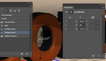 Кликните на иконку Координаты (Coordinates) в верхней части панели свойств и измените значения как показано ниже: (X = 142.5°, Y = 59°, Z = -137.3°).