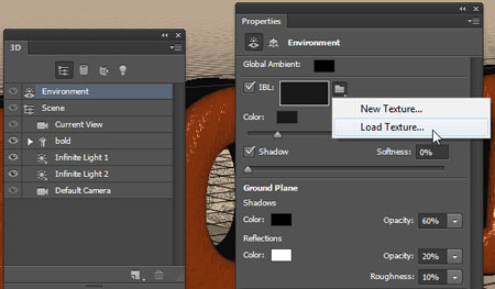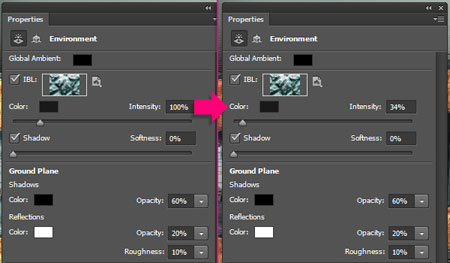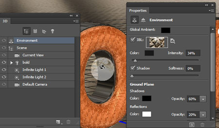 Выделите в 3D панели пункт Окружающая среда (Environment). В панели свойств для Теней (Shadows) измените Непрозрачность (Opacity) до 60%, а для Отражения (Reflections) измените Непрозрачность (Opacity) до 20%. Плавность (Roughness) измените до 10%.