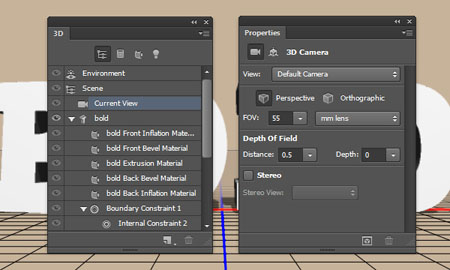Вы также можете нажать в 3D-панели опцию Текущий вид (Current View) и менять вид камеры, чтобы проверить, как сцена выглядит с разных сторон и убедиться, что буквы не перекрывают друг друга.