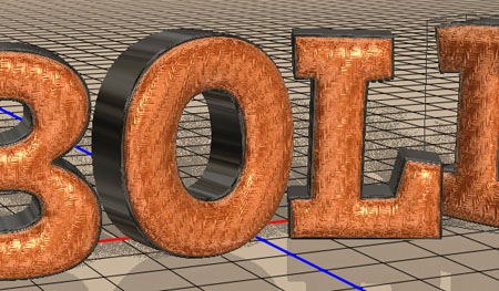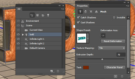 Кликните на названии сетки (ваш текст) в 3D-панели. Затем в панели Свойства (Properties) измените Отображение текстуры (Texture Mapping) на Мозаика (Tile) и поставьте значение Глубины экструзии (Depth) до 70.
