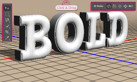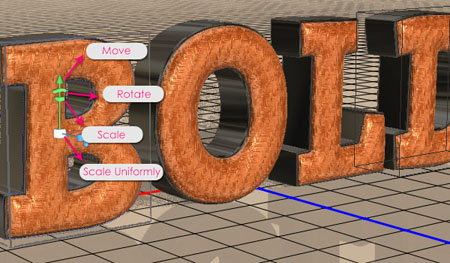 Вы можете просто нажать на сетки (буквы) в 3D-сцене (или выберите имя буквы в панели 3D), для того, чтобы использовать 3D-оси и вносить изменения.