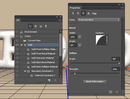 Активируйте иконку Капитель (Cap) в панели Свойства (Properties). В настройках опции Фаска (Bevel) поставьте Ширину (Width) со значением 10%, Угол (Angle) 45° и выберите Контур (Сontour) Полукруг (Half Round). Для настроек Раздувания (Inflate) - Угол (Angle) 90°, Интенсивность (Strength) со значением 10. Это придаст объём (раздует) передней части сетки.