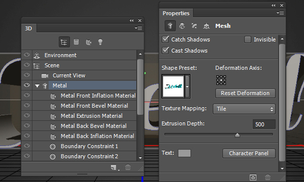 Выберите название сетки (ваш текст) в 3D панели. Затем в панели свойства измените Texture Mapping (Отображение текстуры) на Tile (Мозаика) и Extrusion Depth (Глубина экструзии) до 500.