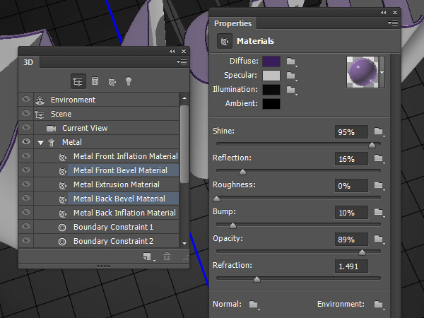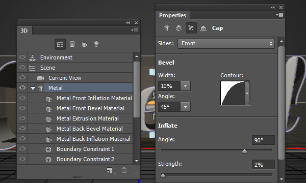 В 3D панели выделите с Ctrl Front Inflation Material (Материал передней выпуклости) и Back Inflation Material (Материал задней выпуклости), затем на панели свойства измените настройки, как показано ниже: