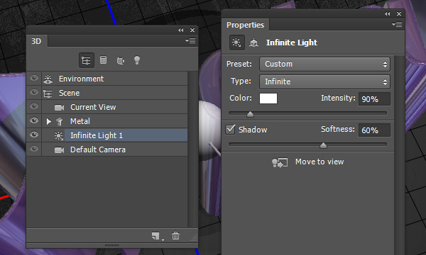 Выберите Infinite Light 1 (Бесконечный свет 1), на панели свойства измените Intensity (Интенсивность) на 90% и Shadow Softness (Тень Сглаживание) до 60%