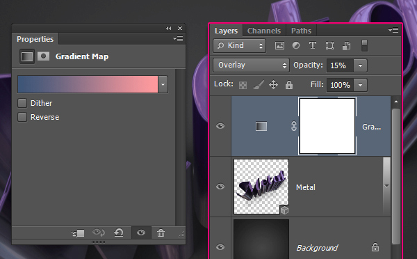 Создайте градиент, используя цвета #3e5678 и #ff9a9e. Измените Режим наложения слоя на Overlay (Перекрытие) и Opacity (Непрозрачность) до 15%.