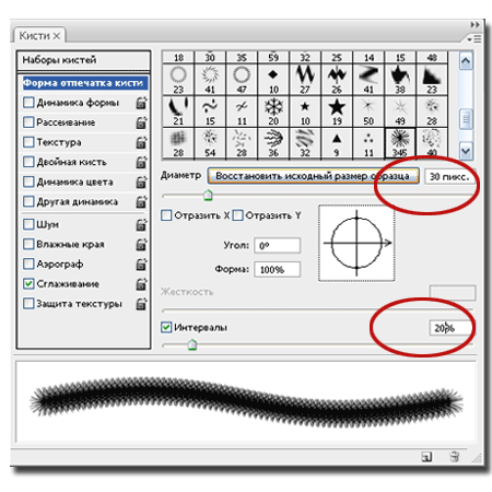 (Pen) в режиме контуров: нарисовать контуры, а затем выполнить обводку контура кистью, увеличив интервалы последней).
