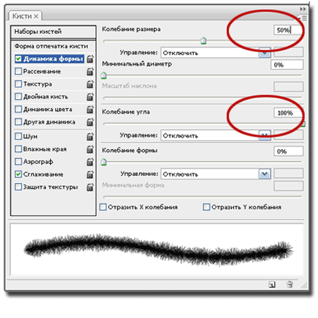 (Brush) и включаем Палитру кистей F5. Для кисти «Хвоя» делаем следующие настройки: