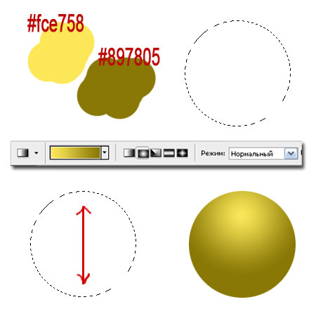 Теперь «повесим» на елку новогодние шары. «Висюльки», на которых держатся шарики на елке, рисовать не будем - мелко, но при желании… Итак, создадим новый слой, назовем его «Шарики». Для основного цвета выберем - #fce758, для фонового – #897805. С помощью инструмента Овальная область (Elliptical Marquee), удерживая Shift, нарисуем круг. Выберем инструмент Градиент