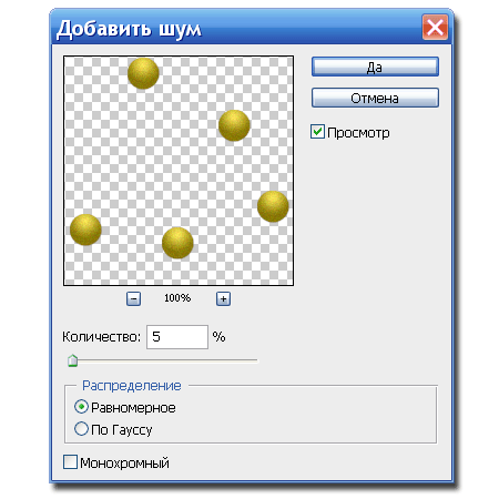 Размножим и «развесим» наши шары на елке используя инструмент Перемещение (Move Tool) и удерживая нажатой клавишу Alt. Получится несколько слоев с шариками. Выделим их и объединим в один Ctrl+E. К слою с шарами применим фильтр Шум: Фильтр>Шум>Добавить шум (Filter>Noise>Add Noise).
