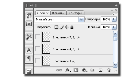 Чтобы не путаться в дальнейшем, назовем слои «Блестинки» и пронумеруем «покадрово», как на скриншоте: