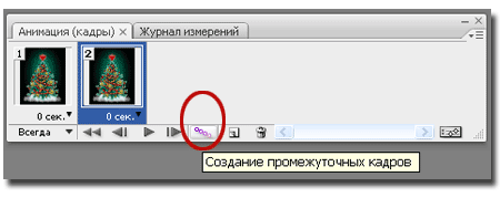 Для первого кадра у нас включены слои: «Фон», «Звездочки», «Снег», «Елка», «Бусы», «Шарики» и «Звезда». То есть должны быть видимы все слои, что и на скриншоте выше. Для первого кадра все оставляем без изменений. Дублируем его кликом мышки на соответствующем значке в палитре Анимация. Второй кадр должен быть выделен синим цветом для редактирования.