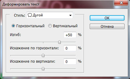 (Horizontal Type Tool), в панели меню выбираем Деформированный текст (Create warped text) и ставим Дугой (Arc)