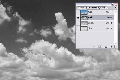 Заметим, что когда вы кликаете по красному каналу, то на изображении появляется четкий контраст между небом и облаками.