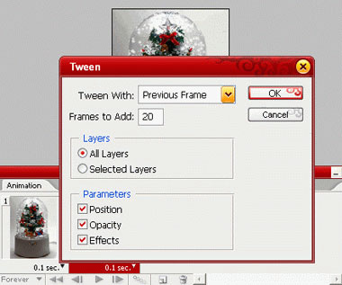 Нажмите кнопку Tween (Создать промежуточные кадры). Примените настройки, как показано на рисунке.