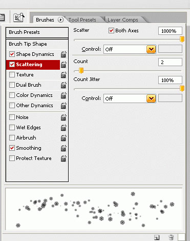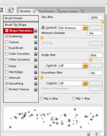 Выберите инструмент кисть. Нажмите F5, чтобы открыть настройки кисти. Выберите кисть и примените параметры, как показано ниже.