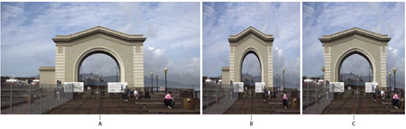 Воспользуйтесь новаторской функцией масштабирования с учетом содержания изображения, позволяющей автоматически перестраивать композицию изображения при масштабировании и сохранять наиболее важные области по мере приспособления изображения к новым размерам. Создавайте безупречные изображения одним щелчком мыши без утомительного кадрирования и ретуширования. На рисунке А показано исходное изображение, на рисунке В – изображение, трансформированное по ширине обычным способом, на рисунке С – изображение, трансформированное с учетом содержания.
